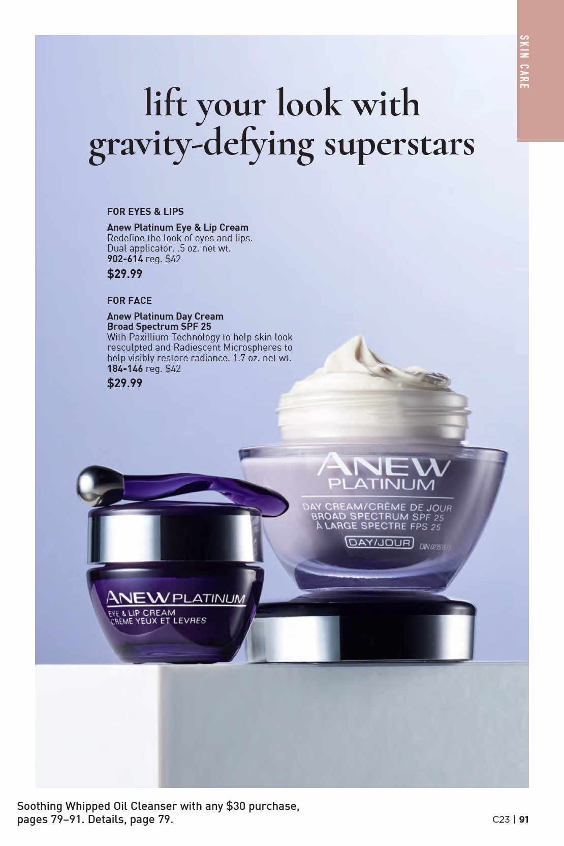 Avon Cosmetics Anew Platinum Day Cream Broad Spectrum - Lifts and reshapes the look of sagging skin. Regain the elegance of a smooth and lifted jawline. In the morning, smooth over cleansed face. SPF 25. Apply evenly before sun exposure and as needed. 1.7 oz. net wt.